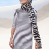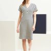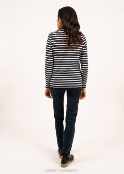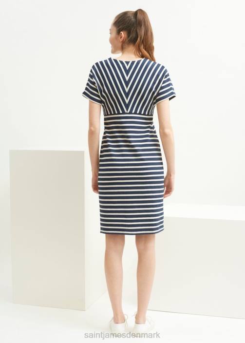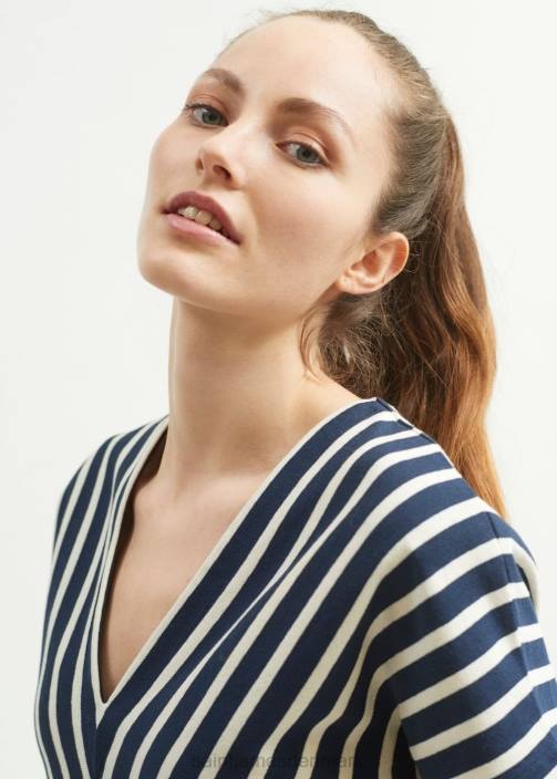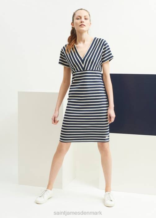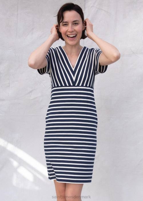 denne v-hals kardede bomuldskjole er en ny klassiker . mens farverne er tidløse, inkarnerer kombinationen af vandrette og diagonale striber et fransk strejf af moderne og chik. et tilbagevendende samarbejde med den unge og talentfulde romain brifault, fransk stylist også baseret i Normandiet, og stolt af det! lavet i Saint-James, Normandiet, Frankrig.